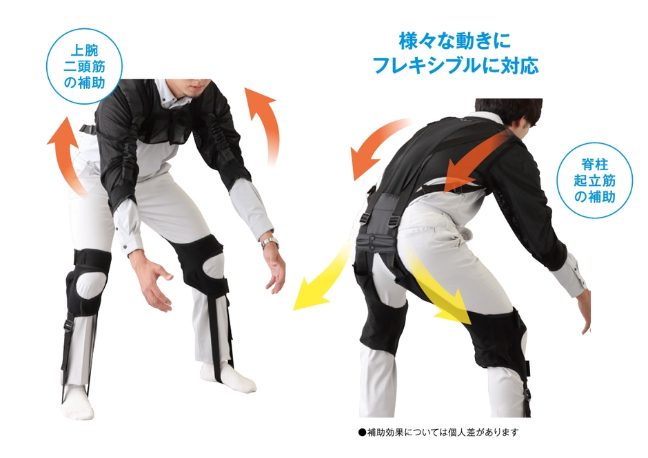 市場のアシストスーツの大半が腰の補助機能のみですが、「e.z.UP(イージーアップ)」は腕と腰を同時に補助し、腰やひざを曲げると腕が連動して自然に持ち上がります。