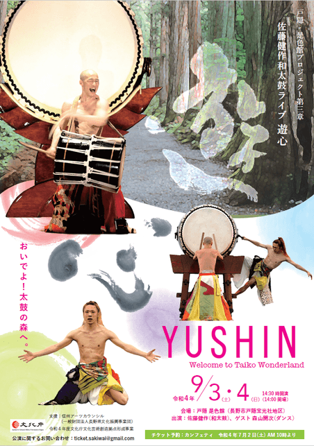 さきわいクレアシオン(長野県長野市)主催、戸隠・是色館プロジェクト第三章『佐藤健作和太鼓ライブ 遊心 YUSHIN 』が2022年9月3日(土) ~ 2022年9月4日(日)に是色館(長野県長野市)にて開催されます。