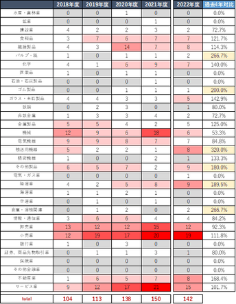 不動産売却を行った企業を業種別に分類し2018年以降の推移を追うと、2022年度の特徴としてこれまでCREの動きが乏しかった「輸送用機器」(過去4年対比320%増)、「陸運業」(過去4年対比189.5%増)の売却件数が大きく増加した点に注目したい。
