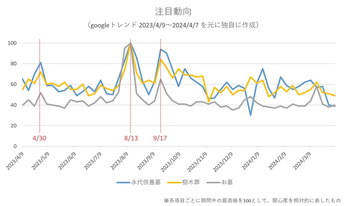 検索数から関心度の推移が分かるGoogleトレンドによると、「永代供養墓」「樹木葬」「お墓」のキーワードでの検索数が最も高まるのはお盆や秋彼岸の時期で、それに次いで高いのがゴールデンウィークであることが分かります。