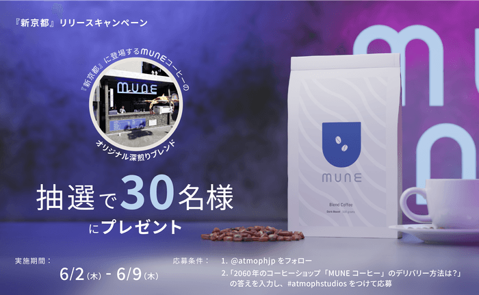 そのリリースを記念して「新京都」に登場する未来の珈琲屋、MUNEコーヒー (ミューンコーヒー) のオリジナル深煎りブレンドのプレゼントキャンペーンも本日から実施します!