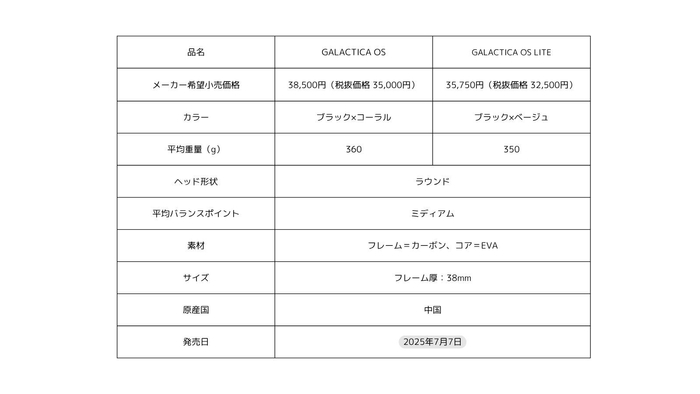 本シリーズは、操作性とスイートエリアの広さを追求したラウンド形状を採用し、上級者はもちろん、初心者にも扱いやすいモデルです。メーカー希望小売価格は、「GALACTICA OS」が38,500円(税抜価格35,000円)、「GALACTICA OS LITE」が35,750円(税抜価格32,500円)です。
