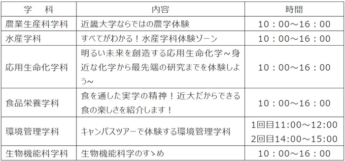 近畿大学農学部のオープンキャンパスでは、「あなたの未来に彩ノウ(さいのう)を」をテーマに、農学部6学科それぞれの特色を生かした学びを体験できるイベントや学科紹介を行います。また、受験生対象の「受験に役立つ英語対策講座」や、保護者を対象とした講演「保護者が持つべき進路の視点」の開催、学生生活や進路についての各種相談コーナーを設置し、高校生の進路決定をサポートします。