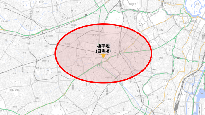 今回は、標準地(目黒-8)周辺の下記エリア内のマンション事例①(築10年~19年)、マンション事例②(築20年~29年)、マンション事例③(築30年~45年)を対象に、過去5年の一般市場価格を抽出します。