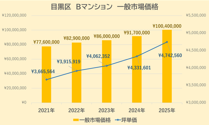 2021年は9,030 万円(坪単価:約426万円 (以下 @426万円) )でしたが、翌2022年は9,550万円(@451万円)、2023年は9,770万円(@461万円)、2024年は10,550万円(@498万円)、2025年は12,030万円(@568万円)と上昇を続けていることがわかります。
