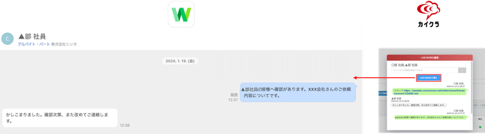 さらに、LINE WORKSサービスのトークルームを呼び出すことも可能です。