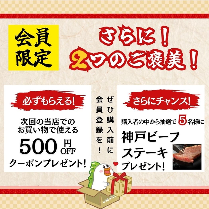 〇 キャンペーンキャンペーン② さらに!ご購入いただいたJAタウン会員様の中から抽選で5名様に、「神戸ビーフ ロースステーキ(200g)」をプレゼントいたします。