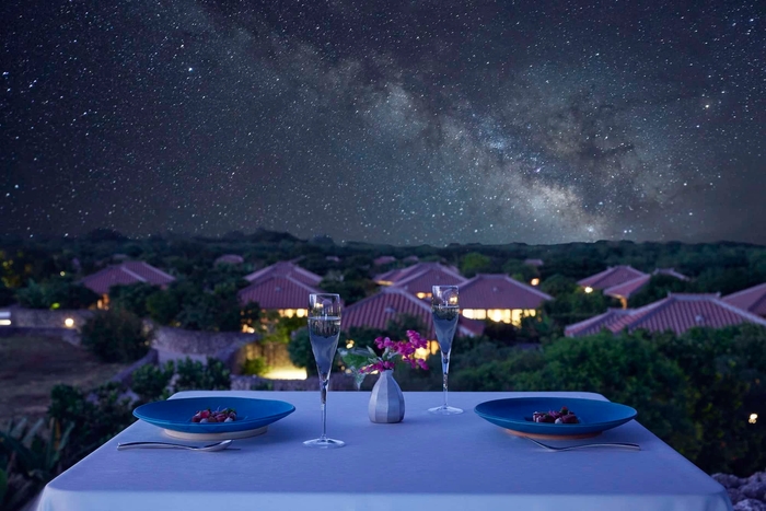 各施設が独創的なテーマで、圧倒的非日常を提供する「星のや」。沖縄県・竹富島にある滞在型リゾート「星のや竹富島」は、2023年6月5日から8月26日までの期間、日程限定で、無数の星に包まれて楽しむ「群星(むりかぶし)ディナー」を提供します。これは、新月に近い夜に施設を一望できる高台「見晴台」を貸し切り、圧巻の星空と集落景観を望みながら堪能するフレンチディナーです。群星とは、竹富島の方言で「星の群れ」を意味します。ここにしかない絶景と、島で親しまれている素材を使ったこだわりの料理を楽しめる、唯一無二の体験です。絶景を楽しみながら、美食に舌鼓を打ちます。