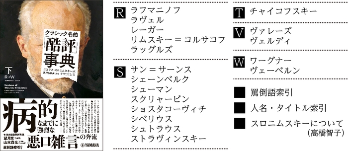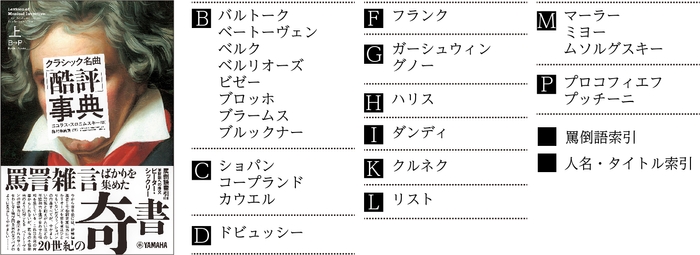 また、本書の大きな特徴とも言える「罵倒語索引」は必見。磨き抜かれた酷評表現の数々に、むしろその曲を聴いてみたい好奇心にかられます。いわゆる「名曲解説」は読み飽きたという方に、“劇薬”となる本書をおすすめします。