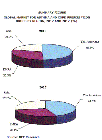 BCCリサーチ社によりますと、世界における喘息・慢性閉塞性肺疾患(COPD)治療薬市場は2011年に349億ドルに、2012年には380億ドルに、そして2017年には4.4%の年平均成長率(CAGR)にて471億ドルに達する見込みです。