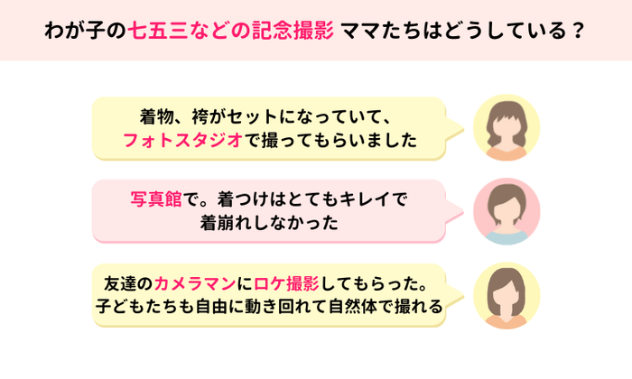 「出張撮影」や「友人カメラマンに依頼する」という声も少なくありませんでした。屋外での撮影は、子どもの自然な表情を引き出しやすいのが魅力。SNSなどでフォトグラファーを探しやすい今、新しい記念撮影のスタイルとして広がっているようです。