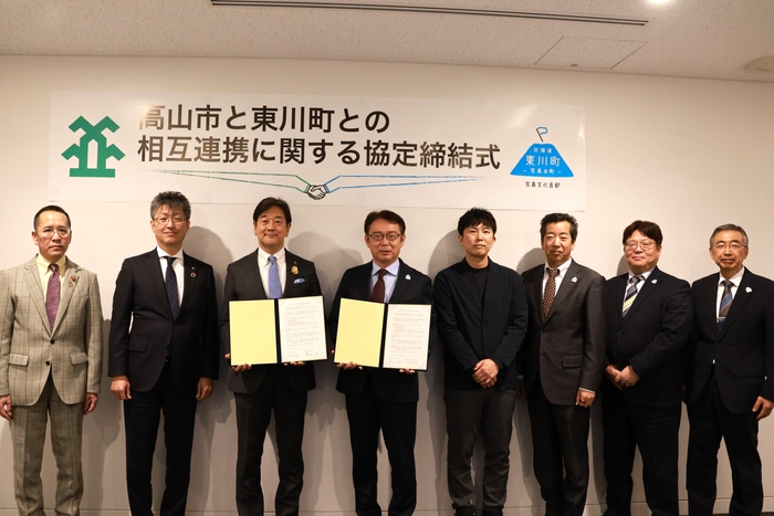 岐阜県高山市と北海道東川町は、相互連携に関する協定を締結しました。協定締結式は、12月26日、北海道東川町にて行われ、田中明高山市長、菊地伸東川町長が協定書に署名を行いました。