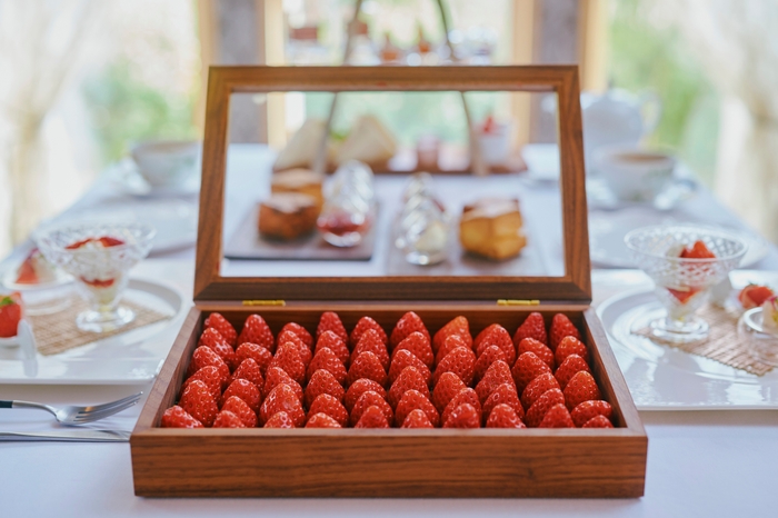 そして昨年もお客様よりご好評をいただきました、季節に合わせて数種類の苺を贅沢に敷き詰めた “苺の宝石箱”も用意。燦々と降り注ぐ日光を浴びて育った鮮度抜群の苺の食べ比べが可能で、甘さや酸味、香り、食感など、それぞれの苺の美味しさを満喫いただけます。当店でしか体験することのできない“苺の宝石箱”をはじめ、見ても食べても美味しい苺のアフタヌーンティーを心ゆくまでご堪能ください。