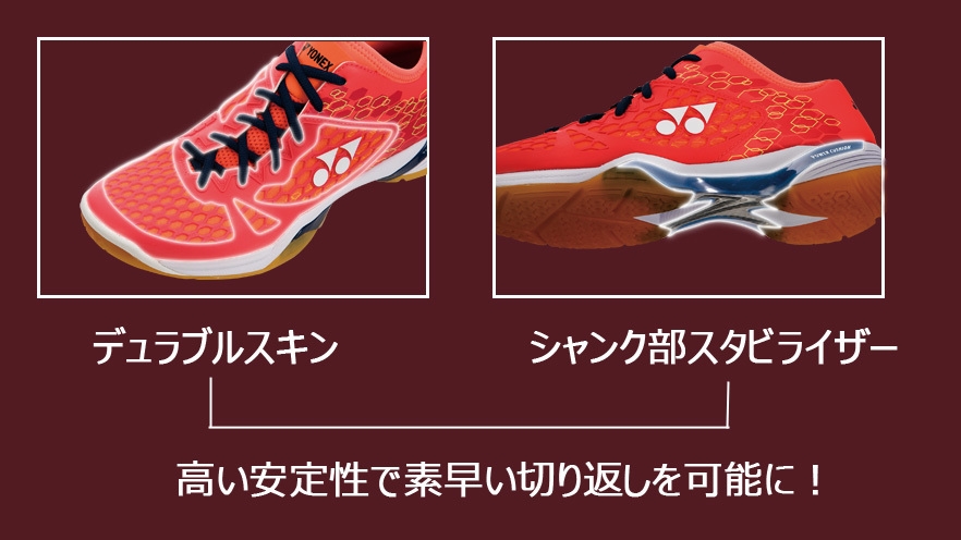 軽量高反発素材「パワークッション」を搭載、さらに前足部の内側・外側・中央部に耐摩耗性と保形力に優れる素材「デュラブルスキン」を配置し、各部位に求められる機能を追求し安定性を向上させました。また当社バドミントンシューズ初となるインナーブーティー構造でフィット感が進化し、切り返しなど激しいフットワークを支えます。また、ハニカム(六角形)のグラデーションでスピード感を表現したシャープなデザインで近未来感をイメージしました。女子シングルスで世界をけん引するプサルラ・V・シンドゥ(インド)は「履き心地が良く、特にフィット感が気に入っています。新しく搭載されたインナーブーティーがシューズとの一体感を高めて、激しいプレーでもブレを抑えてくれるので、長時間動いていても疲れにくく、足元が安定しているのでプレーの幅が広がりました」とコメントしております。