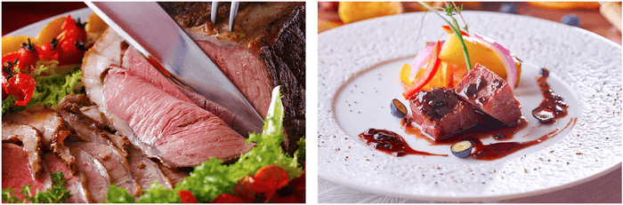 左:ホテル木曽路料理長のスペシャリテ、ローストビーフ。シーズンごとに変わる、その時期にぴったりなソースと一緒にお楽しみいただいています。2022年春のソースは、長野県安曇野のわさびを使用したポン酢ソースをご用意。さっぱりとしたポン酢に安曇野わさびの爽やかな辛さがアクセント。ライブキッチンで切り分けてご提供するご馳走メニューです。