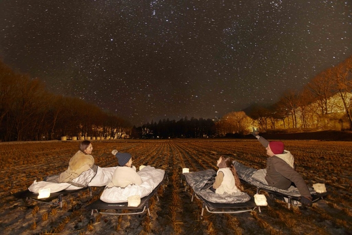 那須の冬の気温は、氷点下になる日も少なくありません。冬の夜は、空気中の水蒸気やちりが少なく空気が澄んでいることから、星をよりくっきりと眺めることが可能です。リゾナーレ那須に隣接している田んぼでは、夕食後の時間帯、空はすっかりと暗くなり、周囲の明かりは少ないため、光輝く星空を望めます。「星空観察」を楽しむために、アウトドア用のベッドや寝袋の他、フィールドスコープや星座早見表などを貸し出します。視界を遮る木々がない田んぼで広い星空の観察をすることが可能です。寝袋にはウォーマーがついているので、あたたまりながら、ゆっくりと星空の観察を楽しめます。