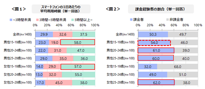 全体では、1日のスマートフォンの利用時間が「5時間以上」が、37.5%であるのに対し、男性15~19歳では58.0%。女性15~19歳では、57.0%と、他の世代と比べ、「5時間以上」のスマートフォン利用の割合が最も高い。<図1>