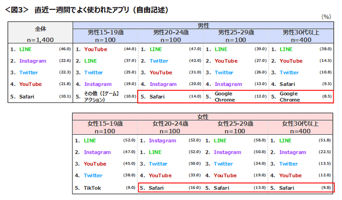 男性30代以上を除く、全ての性年代で、上位4項目が「LINE」「Instagram」「「YouTube」「Twitter」のラインナップ。なお、20代以上では、上位5項目目に「Safari」や「Google Chrome」といった”検索ブラウザ”がランクイン。デジタル・ネイティブ世代である10代の特徴なのか、ライフステージの変化に伴うものか、今回の調査では断言できないものの、若年層での情報収集の手段として、SNSによる検索が主流になってきていることが、仮説として考えられる。<図3>