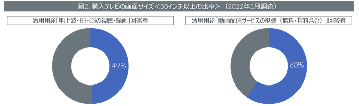 活用用途で「動画配信サービスの視聴(無料・有料含む)」と回答した人の購入テレビの画面サイズを見ると、60%が50インチ以上の製品を選択していることが分かった(図2)。これは「地上波・BS・CSの視聴・録画」と回答した人の50インチ以上の購入率49%と比較して11%ポイント高く、テレビで動画配信サービスを視聴する人はより大型の製品を購入する傾向があると言えるだろう。