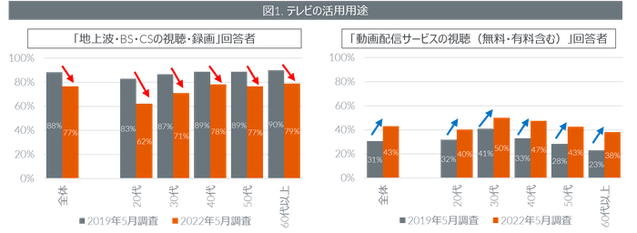 テレビの活用用途を、コロナ以前の2019年調査結果と比較すると、「地上波・BS・CSの視聴・録画」が88%から77%に減少、一方で「動画配信サービスの視聴(無料・有料含む)」が31%から43%に増加した(図1)。