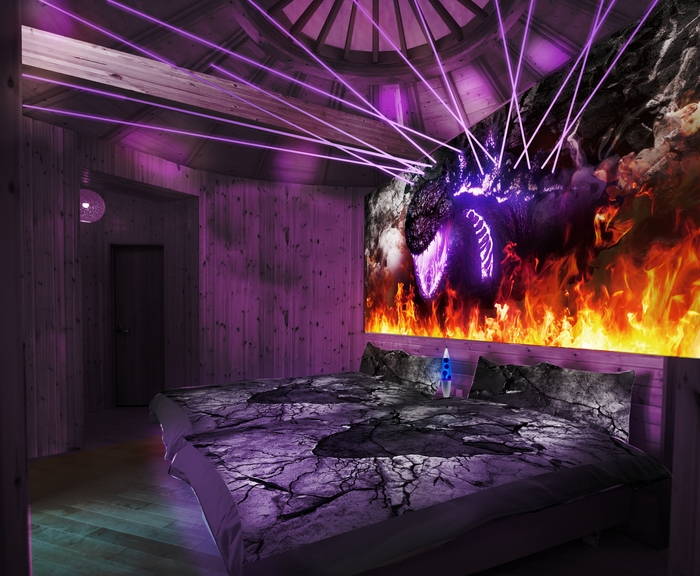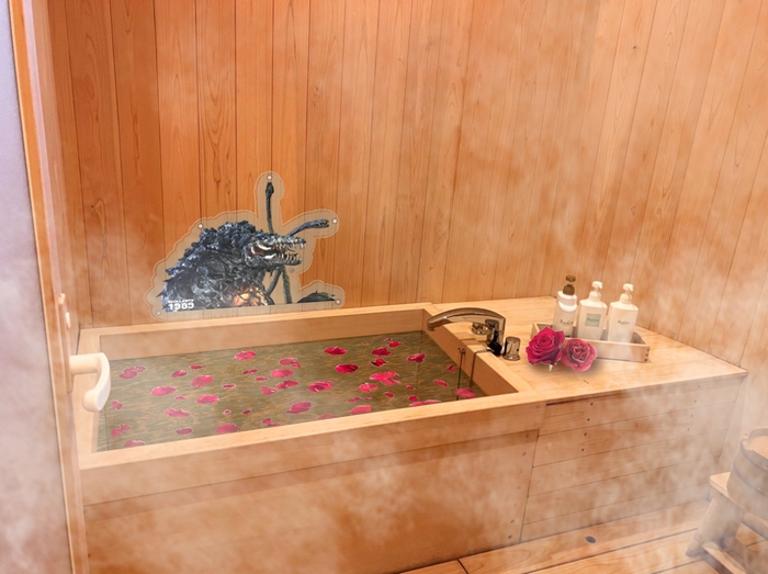 室内には、歴代ゴジラと人気怪獣たちが描かれたインテリアやタペストリー、窓越しに見える実寸大ゴジラの一部、さらに、それらに光の照射で見え方が変わる特殊加工を施すことによって、昼・夜で異なった室内の雰囲気をお楽しみいただけます。室内に隠れた全ての怪獣たちを見つけ出すことで豪華特典が手に入る“特別任務”に挑戦していただくなど、昼夜通してお愉しみいただけるお部屋です。