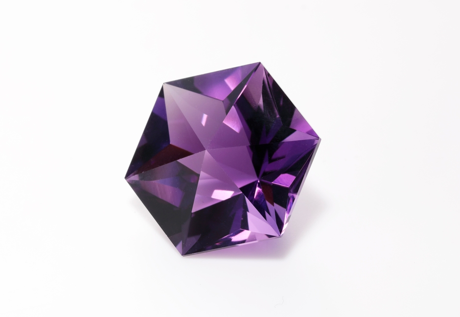 六角形の天然石アメジストの表面は六角錐カット、裏面は36面体カット。