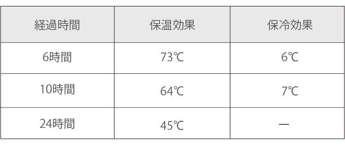 保温(保冷)効果とは、室温20℃±2℃において95℃±1℃の熱湯(4℃±1℃の冷水)を満たし、所定時間放置した場合の温度です。