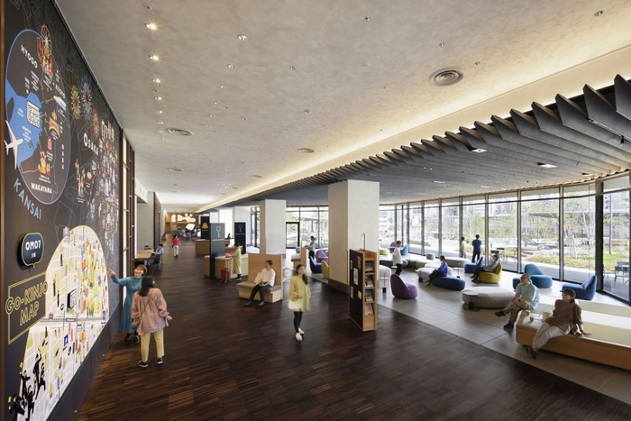 大阪の旅を楽しくするディープな仕掛け満載のパブリックスペースです。全長約85メートル、高さ約5メートルの開放的な空間には、街の情報がつまった「ご近所マップ」に加えて、「OMOカフェ&バル」「OMOダイニング」「ライブラリーラウンジ」を有しています。大きな窓からは、都会にいながらも四季の移ろいを感じる景色を一望できます。