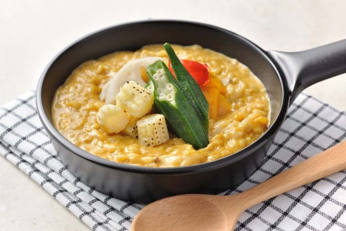 カレーベースのリゾットにグリル野菜をたっぷりとのせたリゾット。ピリッとしたアクセントが楽しめます。