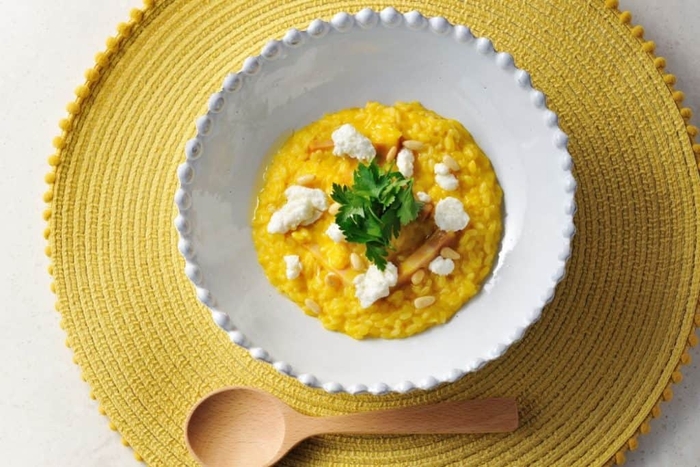 かぼちゃベースのリゾットにリコッタの風味、松の実の食感、ベーコンの旨味を合わせたリゾット。