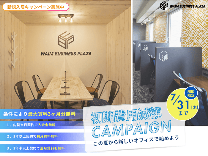 ワイムシェアリング株式会社(本社:東京都新宿区、代表取締役社長:佐藤直史)は、レンタルオフィス「ワイムビジネスプラザ」全店舗において、2025年7月末日までの期間限定で初期費用減額キャンペーンを実施いたします。