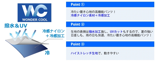 本商品は、肌側に冷感ナイロン糸を使用、さらに冷感加工を施した冷たい履き心地が特徴のパンツです。表側生地には水を弾く撥水加工を施し、夏の強い日差しも気にならないUVカットがついています。また縦横2wayのハイストレッチ素材なのでとても動きやすく、快適な履き心地です。