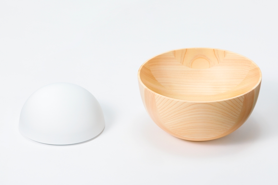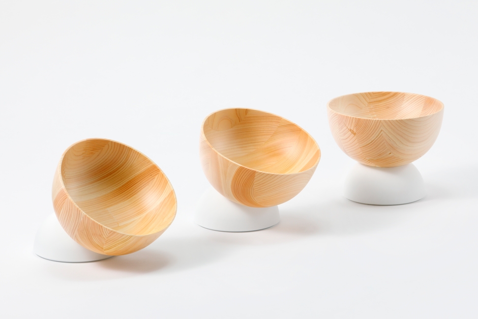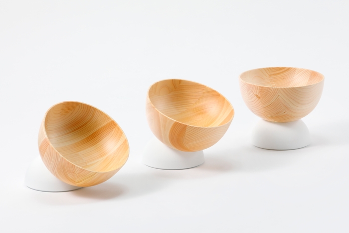 ヒノキの集成材から削り出されたボウルが、半球状のベースに自由な位置で固定できます。