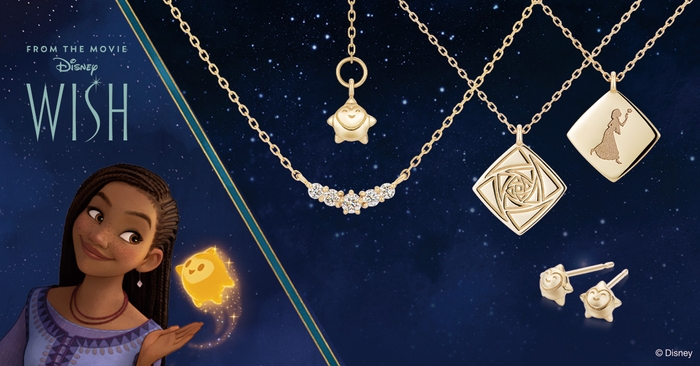 新作ディズニー映画『ウィッシュ』をテーマにしたジュエリー ダイヤモンドネックレス、プレートネックレス、ピアス12月8日(金)新発売。 ヒロイン「アーシャ」や「スター」をモチーフにきらめくデザイン