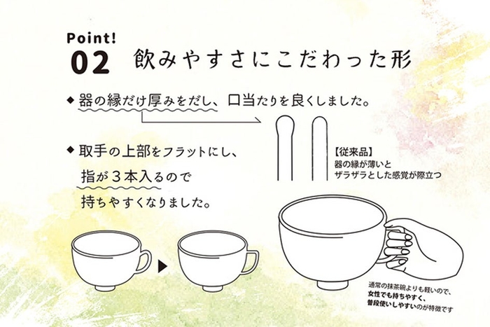 従来のマグカップよりも丸みがあり、内側を垂直に仕上げているので茶筅が振りやすく、取手には指が3本入るので安定して抹茶を点てることができます。器の縁は厚みをだし、口あたりが心地良い飲み口となっています。