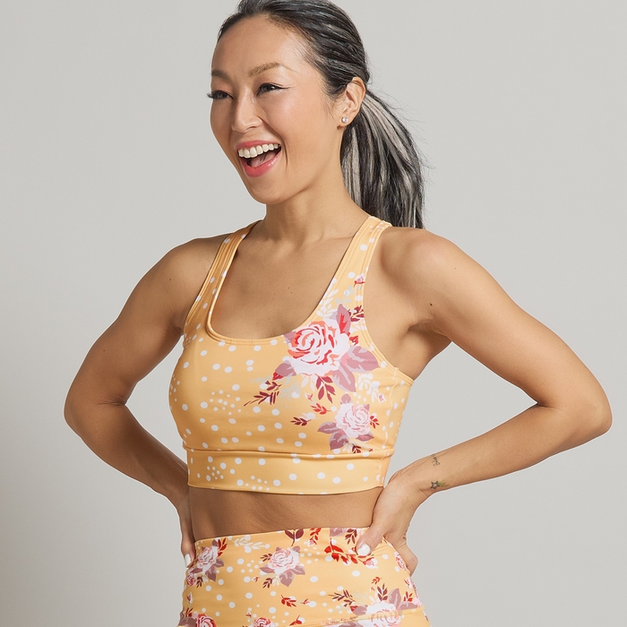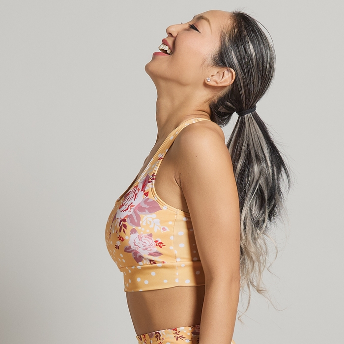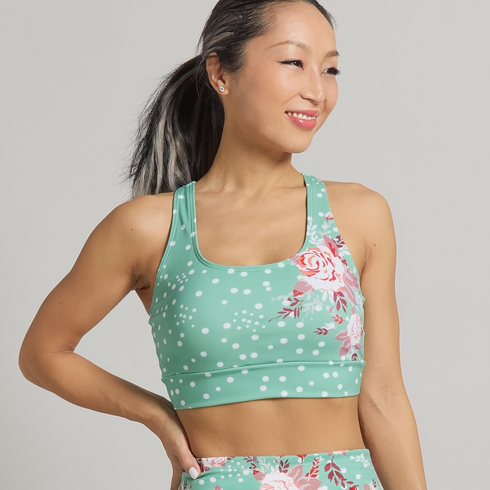 ミントグリーンとイエローの明るいカラーをベースに、キュートなドット柄、女性らしいバラ柄があしらわれたデザインで、切るだけで心がぱっと明るくなるような華やかなフィットネスウェアです。