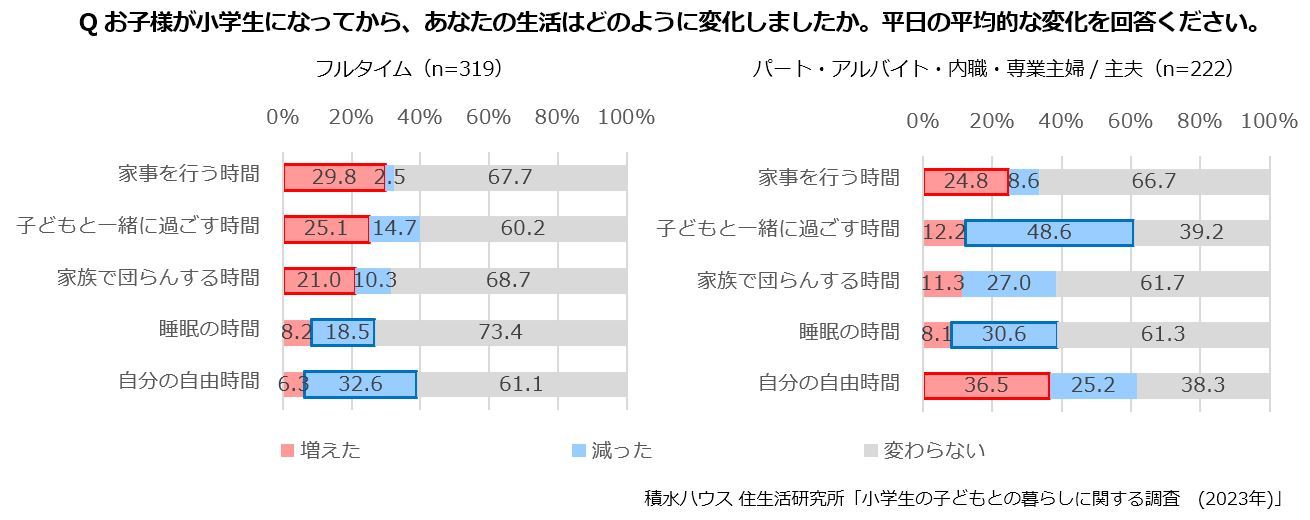 パートタイム勤務や専業主婦/主夫では、約半数の人が「子どもと一緒に過ごす時間が減った」と回答しましたが、「自分の自由時間が増えた」人が36.5%いることから、子どもが小学校へ通っている時間を自分の自由時間に充てられるようになった人もいることが予想されます。