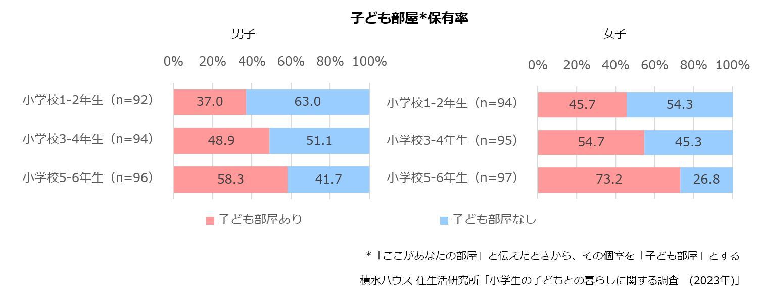 子ども部屋の保有率は、小学校1-2年生男子では37.0%、女子は45.7%と、男女ともに小学校低学年までに子ども部屋を与えられている人は半数以下であることが分かりました。小学校5-6年生では、男子は58.3%、女子は73.2%と男子よりも14.9ポイント高くなり、女子の方が子ども部屋を与えられている割合が高い結果になりました。