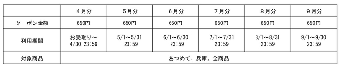 合計3,900円分のクーポンの利用期間は2023年4~9月で、各月650円分ずつご利用いただけます。ぜひこの機会に、当ショップでのお買い物をお楽しみください。