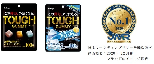 日本マーケティングリサーチ機構が2020年12月に実施した、グミ商品におけるインターネット調査の結果、『タフグミ』ブランドが、「集中したい時に食べたいグミ No.1」「ハードグミ人気 No.1」を獲得しました。小腹が減ったときはもちろん、仕事でもうひと頑張りしたい、運転中で集中したい、勉強のお供としてもおすすめです。