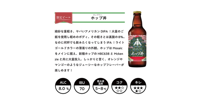 事業内容:伊勢神宮近くに本社・醸造所を構え、「あなたの人生にエールを!」をスローガンに掲げるクラフトビールブランド。創業当時から、無謀だと言われることや誰も挑戦していないことに積極的に取り組んで参りました。その結果、国内外の品評会で数多く受賞し、ビール界のオスカー賞と言われる最も歴史ある英国IBAで2017年・2019年・2021年と日本勢初となる3大会連続でゴールドメダルを受賞致しました。10種の定番商品をはじめとし、様々な種類のビールの製造を展開。豊かなビール文化を協創すべく世界基準で”本物”のビールをお届けしています。