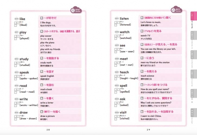 さらに、効率よく英語の成績があがることを目的に考えられた順番で単語を掲載しています。動詞と名詞を覚えるとグンと英語が読めるようになりますから、この本でも動詞、名詞をメインに覚えていき、そのほかの品詞に進みます。進んでいくほど、英語が得意になる単語帳です。