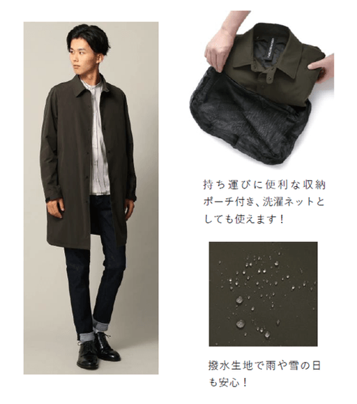 今回発売するコートは袖口と裾口に複数の小さな穴を備えており、洗濯中に表地と裏地の間やポケットなどコート内部に侵入した水が、この穴から外に流れ出す仕組みを取り入れることでマシンウォッシュを可能にしました。また、コートにはメッシュ状のポーチがセットになっており、コートをバッグに入れて持ち運ぶための収納ポーチとして使用できる他に洗濯ネットとしても使えます。生地は小さく折り畳んでもシワになりにくいことに加えて、洗濯後に乾きが早い素材を採用しました。さらに、撥水性も備えているため雨や雪の日も安心です。