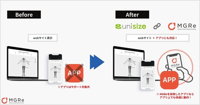MGReとunisizeが連携したことにより、既にECサイトにunisizeを導入済みのお客様は、MGReを導入いただくことでunisizeが快適に動作するアプリの導入が可能になります。