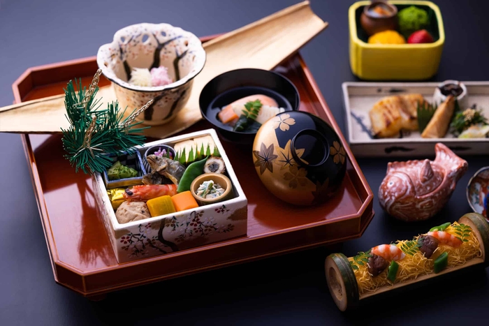 夕刻には、ライトアップされた夜桜の下で総料理長特製の光琳膳を味わいます。江戸時代の絵師・尾形光琳(おがたこうりん)が嵐山での花見の席で金箔の蒔絵を施した光琳笹(こうりんざさ)*2に春の食材を盛り付けたことにならい、光琳笹や桜の器を使った華やかな御膳に仕上げました。やわらかな蒸し鮑(あわび)や筍、稚鮎(ちあゆ)など滋味豊かな春の食材をふんだんに使い、手元でも華やかに花見を楽しめる御膳です。