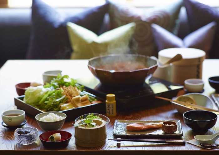 やわらかな朝日に照らされる桜の下で食べるのは、野菜たっぷりの朝鍋朝食です。胃の動きを助ける自然の苦みがある菜の花や山菜など旬の野菜を、総料理長特製の昆布とかつおの香り高い出汁で食べます。少し肌寒い春先の身体を芯からあたため、滋養をつけることができます。朝食の後には、本プログラム特製の和菓子とスタッフが点てたあたたかな抹茶を味わいます。和菓子は、創業100余年の老舗和菓子店「有職菓子御調進所(ゆうそくがしごちょうしんじょ) 老松(おいまつ)」が本プログラムのために手掛けた、きんとんです。「花の宴」という名前がつけられており、「花桜テラス」に咲く桜をイメージして白とピンクのそぼろ餡をまとわせています。目の前に広がる情景を映した和菓子とあたたかな抹茶で、花見の余韻に浸ることができます。