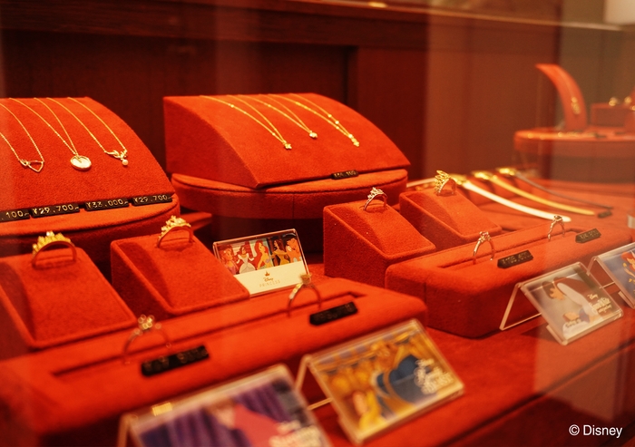 ケイウノでは、2010年より全国の直営店でディズニーデザイン ジュエリーの取り扱い並び、オーダーメイドを手がけています。「ディズニーコーナー」併設店は3店舗(横浜元町店、名古屋栄店、神戸店)あり、製作点数のわずかなジュエリーもディスプレイしています。