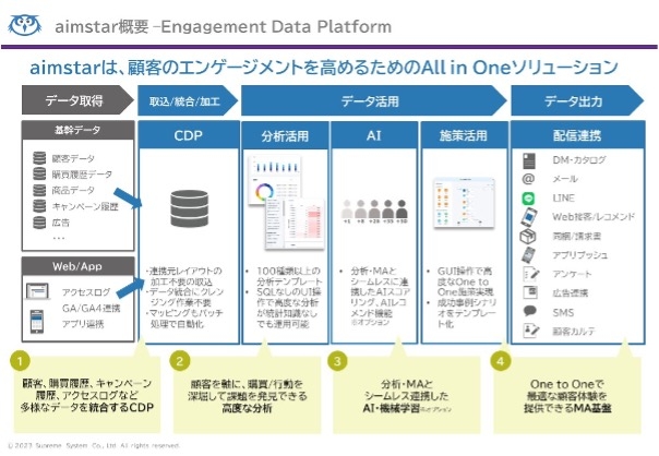 「aimstar」に蓄積されている購買データや、年齢や性別などの属性データ、各チャネルの行動データ等から抽出した顧客セグメントやレコメンド情報に基づくOne to Oneのアプリマーケティングシナリオを、「MGRe」を介して実現いたします。