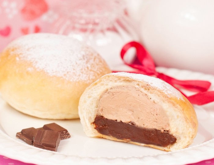 商品特徴:香ばしいジャンドゥーヤチョコと濃厚なミルクチョコの2種類がたっぷり楽しめる贅沢チョコクリームパン。