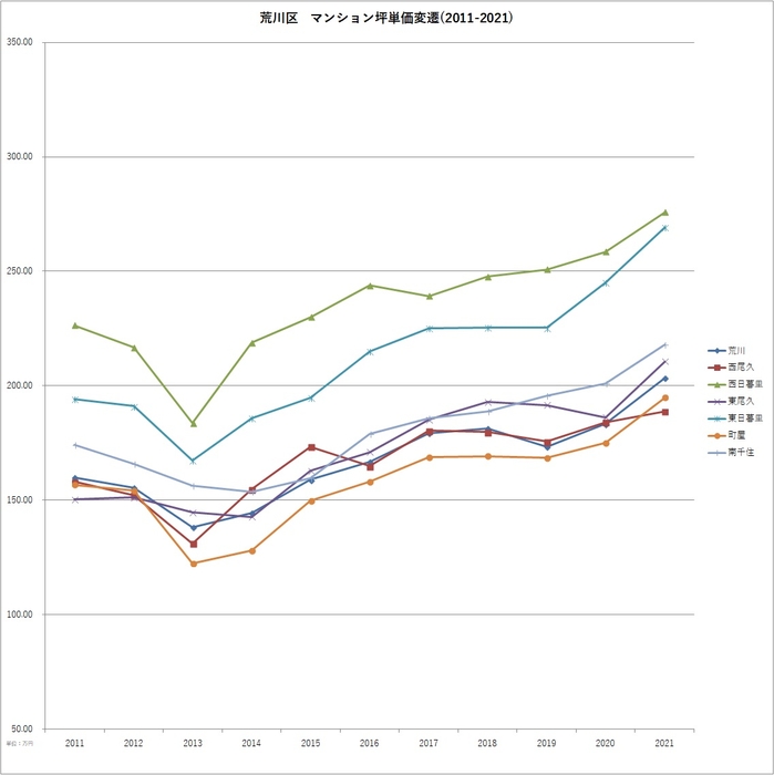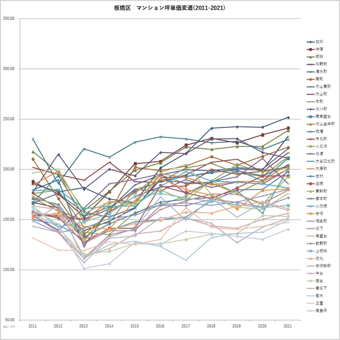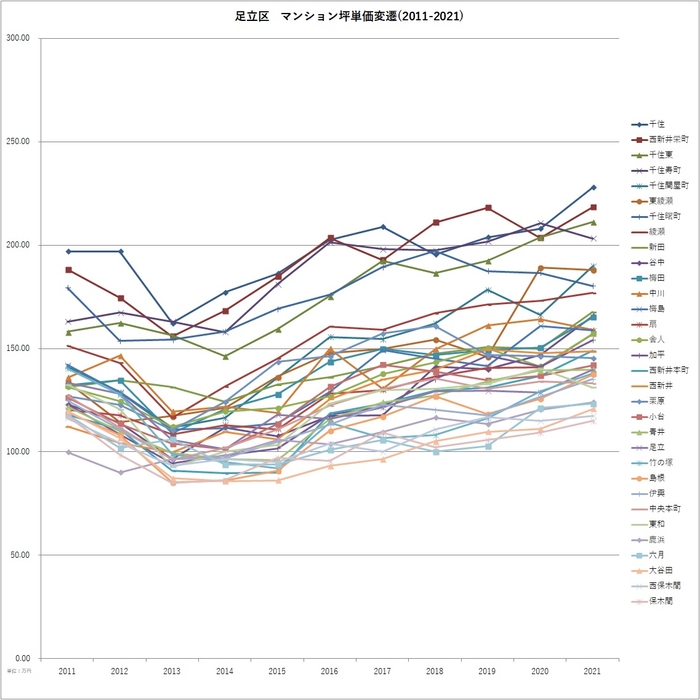 2011年と2021年のマンション坪単価より騰落率を算出。
